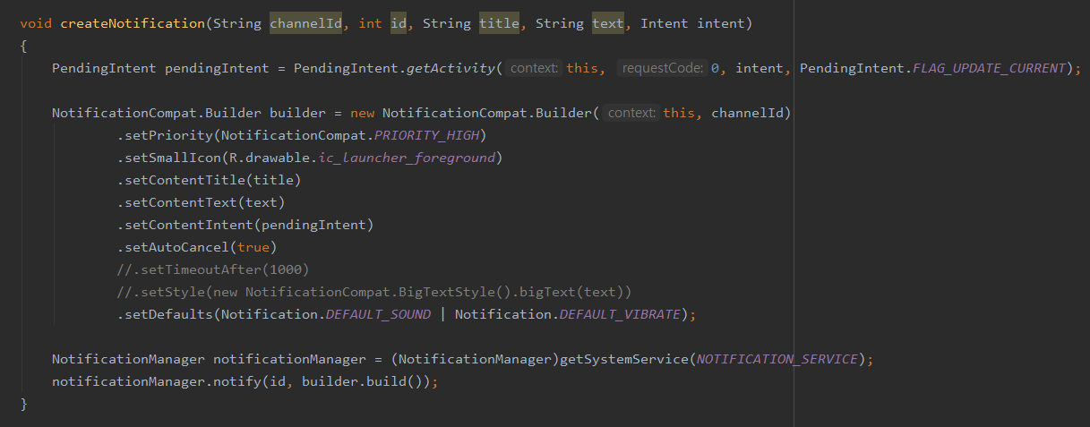 - setTimeoutAfter() : 지정한 시간 이후 알림이 취소된다. (화면에서 사라진다)