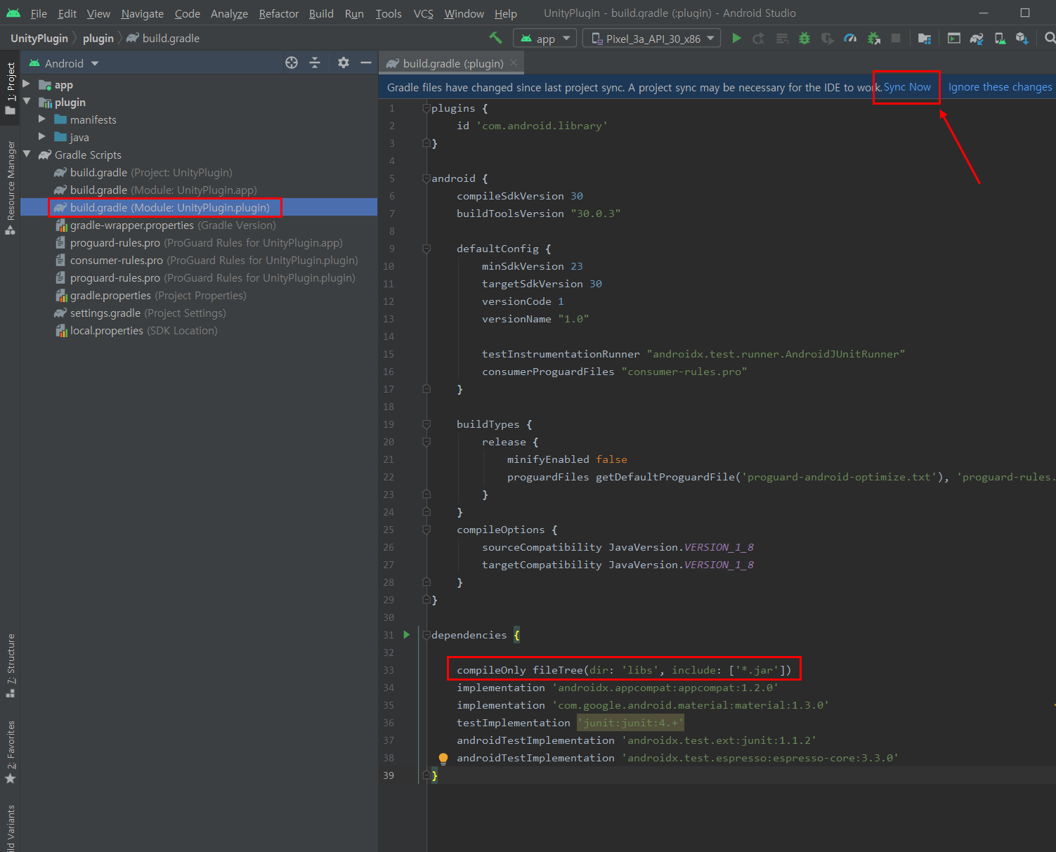 (libs 폴더의 유니티 classes.jar을 사용하기 위함이다. sync가 되면 com.unity3d.player.UnityPlayer 클래스를 사용할 수 있다.)