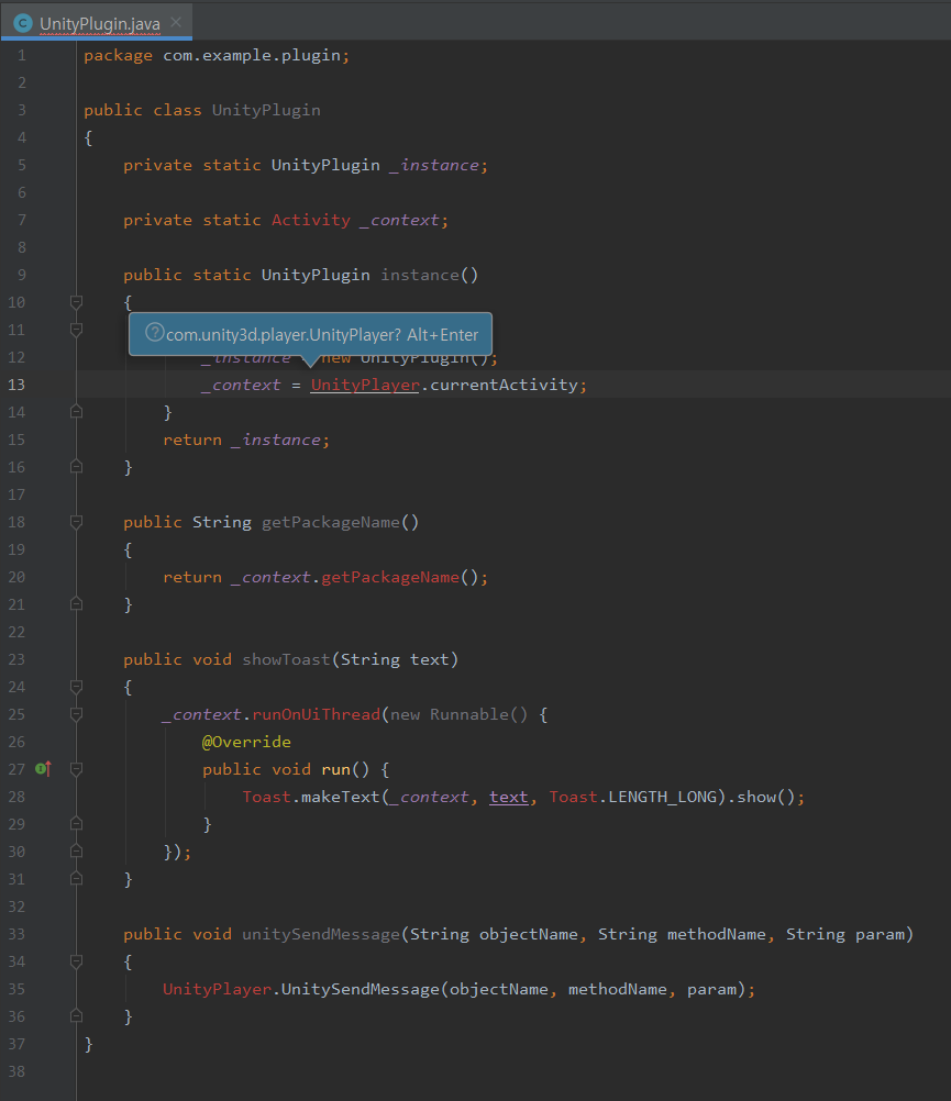 이제 plugin 모듈에 UnityPlugin 클래스를 생성하고 코드를 작성한다.