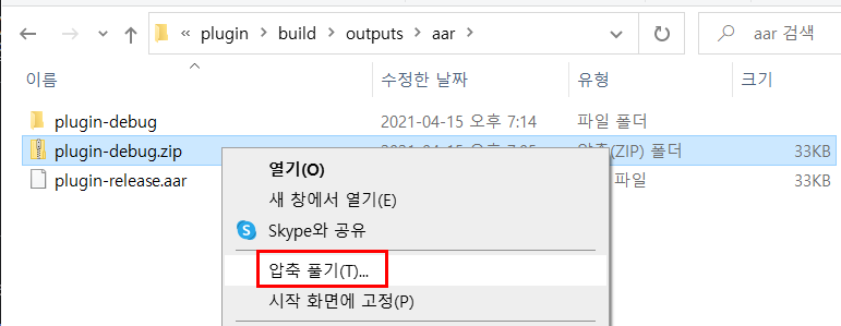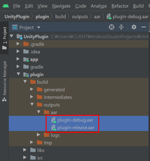 빌드가 완료되면 plugin/build/outputs/aar 폴더에 AAR 파일이 생성된것을 확인할 수 있다.